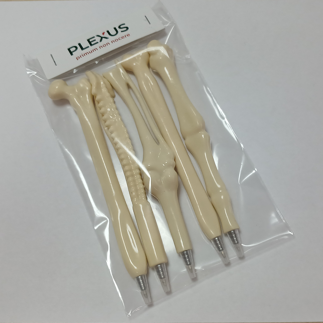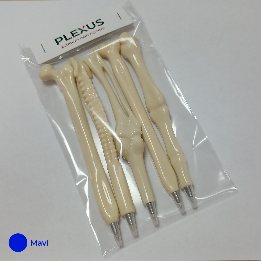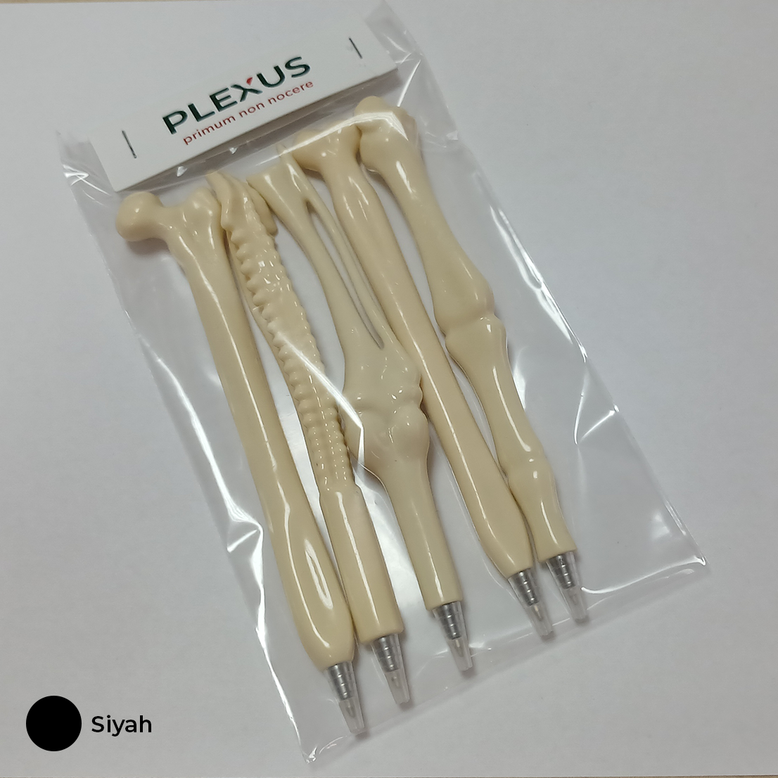 Kemik tasarımlı 5’li tükenmez kalem seti: Omurga, Femur, Parmak Kemikleri, Diz Kemikleri ve Standart Kemik tasarımı olmak üzere toplam 5 adet farklı kalemden oluşur.